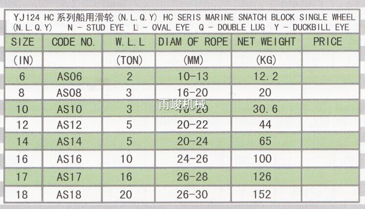 • Product description: HC Series Marine Snatch Block Single Wheel, have four items, N,L,Q,Y N-Stud Eye, L-Oval Eye, Q-Double Lug, Y-Duckbill Eye. Size from 6 inch to 18 inch, WLL from 2 Ton to 20 Ton